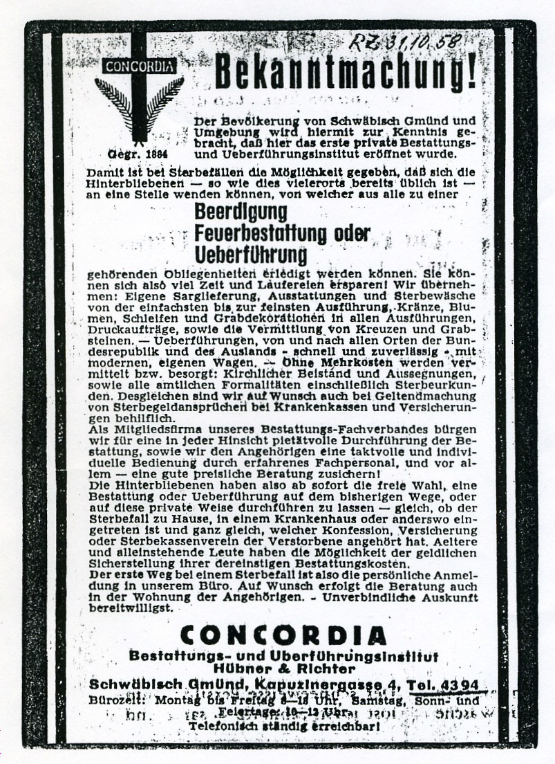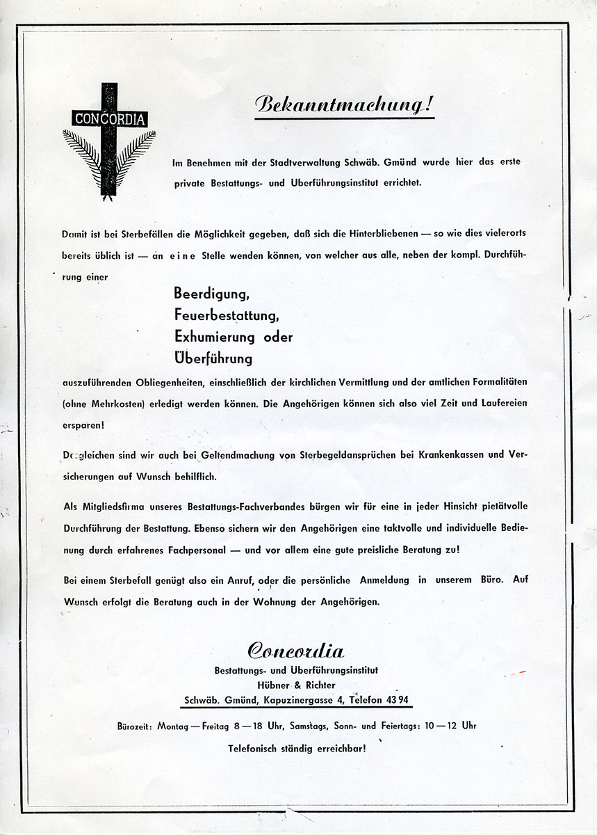 Seit 1958 sind wir, das Bestattungsinstitut Concordia in Schwäbisch Gmünd, die zuverlässige Adresse für Hinterbliebene im Trauerfall.